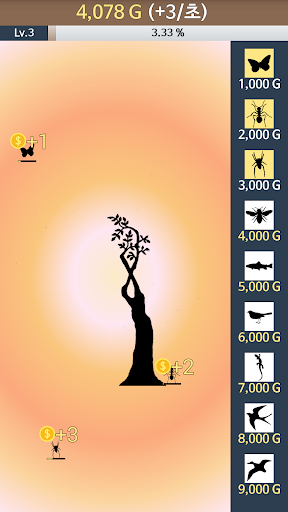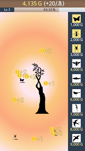 나무 그림자를 클릭할 때마다 경험치를 얻습니다. 경험치가 모이게 되면 레벨업을 하게 됩니다. 레벨업을 할수록 나뭇가지가 점점 풍성해지면서 나무 그림자가 자랍니다. 레벨이 오르면 오를수록 떨어지는 돈의 양도 많아집니다.