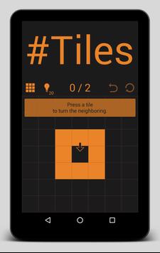 #Tiles is a puzzle game with a simple but addictive gameplay. The playing field consists of 7x7 #Tiles. Tap a tile to turn the neighboring. If #Tiles get turned twice they are back in there original color. Can you make all #Tiles black?