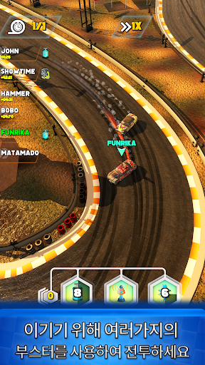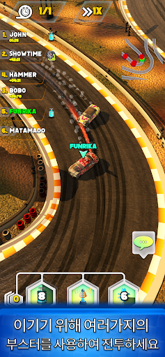 상대와 경쟁할 때 전략은 매우 중요한 요소입니다. 보스마다 게임에서 이기기 위한 전략이 다릅니다. 당신의 전략은 무엇인가요?당신은 지뢰와 기름으로 도로를 가득 채워 상대를 당황하게 하거나 미사일과 충격파로 그들을 제거할 수 있습니다.터보와 완벽한 스타트를 사용하여 결승선으로 바로 갈 수도 있지요.전략을 잘 선택하여 Top Race목록에 오르세요.
