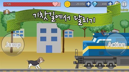 장애물과 함정을 피해 뛰기를 해보시고 간식과 사료를 먹여서 체력을 채워서 더 오래 달려 보세요.🍩