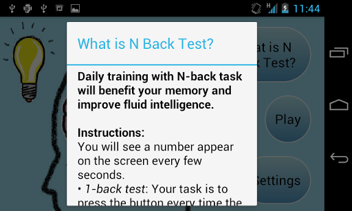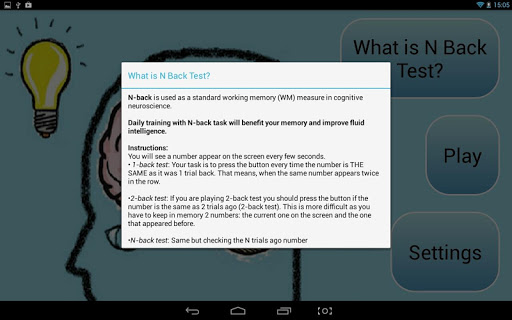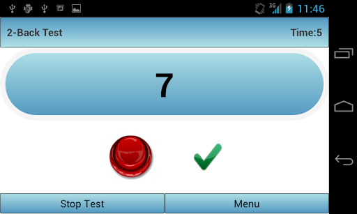 In 2008 Susane's Jaeggi research has shown that regular practice with 2-Back Test improves your working memory and concentration, that leads to increase of your fluid intelligence. This APP will allow you to practise in a easy and entertaining way where you can adjust difficulty levels and informs you about your progress.
