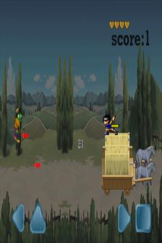 The ninja will be throwing weapons like shuriken star and boomerang at the zombie trying to kill it. The zombie can avoid the weapons by jumping and shooting the ninja in order to become the winner.