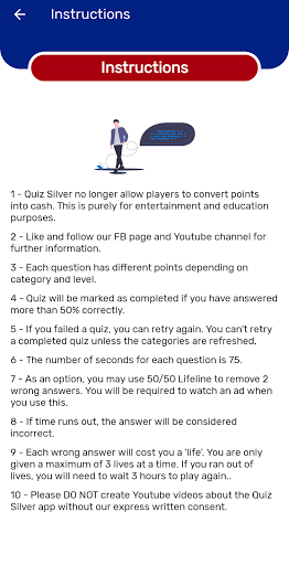With different levels of difficulty, countdown timer, 3 lives, 50/50 lifeline and many other features, learning through the Quiz Silver app is never boring. Point system lets you compare your level of expertise with your friends.