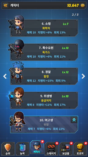고유한 능력을 가진 16여종의 캐릭터로 스테이지에 도전할 수 있습니다. 그들은 시민, 해병대원, 격투가, 용병, 저격수, 소령, 특수요원, 경찰, 위생병, 여고생, 여행가, 소대장, 차장, 폭탄요원, 특수경찰, 메이드입니다.