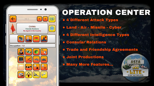 ● 원하는 모든 국가를 공격하고 세계를 정복하십시오. ● 토지 운영으로 국가를 점령하십시오. ● 공기 및 미사일 공격을 실시하십시오. ● 다른 나라에서 사이버 공격을하십시오. ● 무역 및 평화 상품을 만드십시오.
