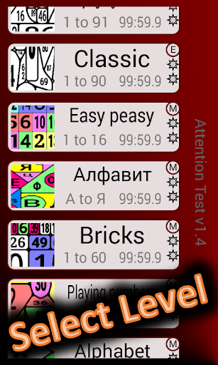 좋은 결과를 얻고 시력, 기억 및주의를 향상시키고 싶다면 정기적으로 게임을 할 필요가 있습니다. 적어도 하루에 한 번 하드 레벨을 연주합니다 ( "H"로 표시). 또는 하루에 여러 번 중간 수준 ( "M"로 표시).