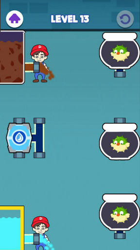 The engineer began his journey for his own prize and to save the fish, but the pipe puzzle is not easy to connect . What you need to do is to connect the pipes in the right order, so that the engineer can take the prize and save the fish so they don't run out of water, wolves and monsters safely.