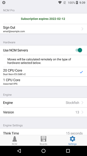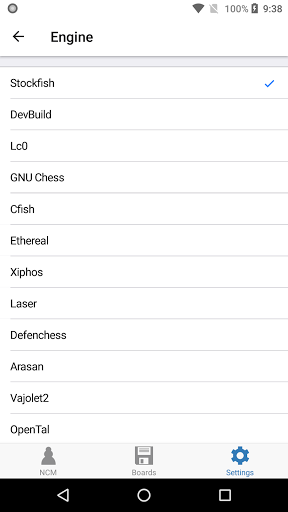 NCM은 장치에서 직접 STOGFIRE 13을 실행하는 강력한 체스 계산기입니다.이 앱에는 NCM 단일 코어 CPU 하드웨어에서 실행되는 엔진 목록에 대한 액세스가 포함되어 있습니다 :