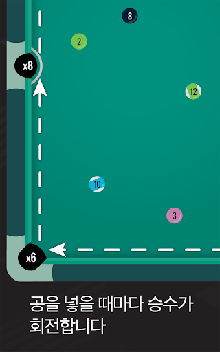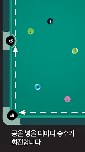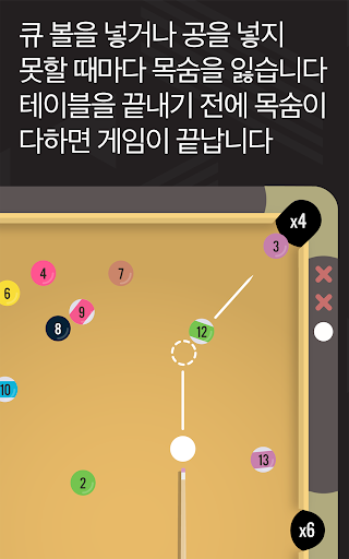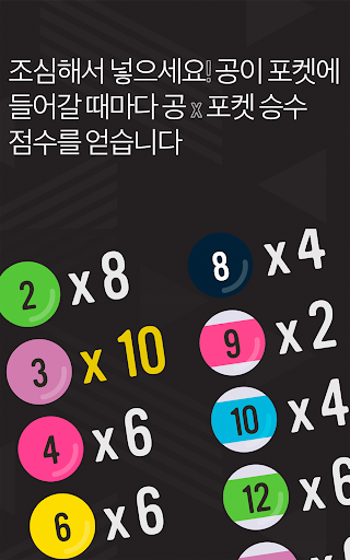 공이 들어갈 때마다 해당 포켓에 따라 점수를 받습니다. 공을 조심해서 넣으세요. 공이 들어가지 않거나 큐 볼을 넣으면 목숨을 잃고, 테이블을 끝내기 전에 목숨이 다하면 게임이 끝납니다.