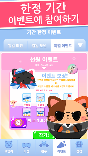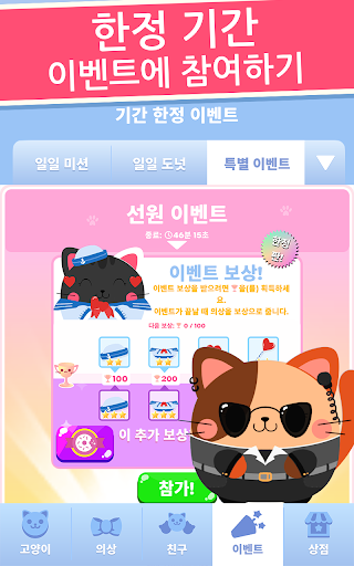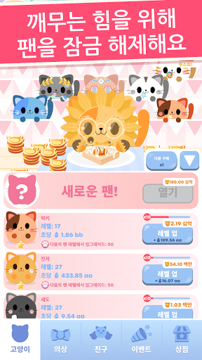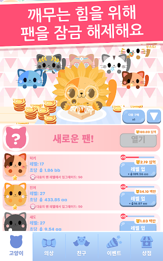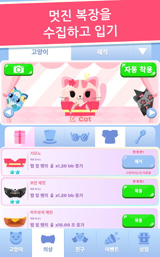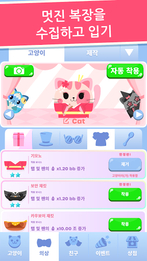 의상에 대해 말했었나요? 수집할 귀여운 의상이 너무 많아요! 고양이를 작은 선원, 활짝 핀 해바라기 또는 프로스팅한 도넛처럼 옷을 입혀 보세요. 마구 탭하여 간식을 먹고, 코인을 얻고, 팬을 업그레이드하여 먹기 능력을 높이고, 더 많은 간식을 먹으세요!