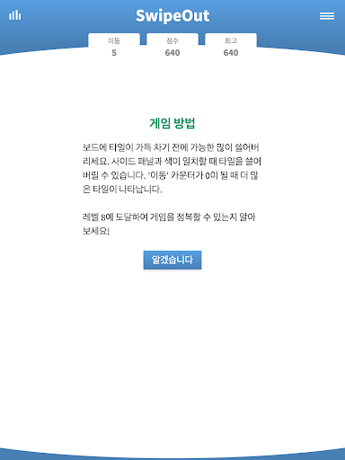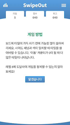 이 게임의 목표는 보드에 있는 색깔 있는 타일을 가능한 많이 쓸어버리는 것입니다. 색깔 있는 타일은 오직 같은 색의 사이드 패널로만 쓸어버릴 수 있습니다. 이동 카운터가 0이 될 때 더 많은 타일이 나오니 쓸어버릴 때 전략을 잘 세우고 조심하세요. 보드에서 타일을 쓸어버릴 때마다 점수가 오릅니다. 점수가 오를수록 더 어려워집니다! 전략을 잘 세워서 가능한 오랫동안 게임을 하여 점수를 최대한 올리세요. 레벨 8에 도달하여 게임을 정복할 수 있는지 알아보세요!