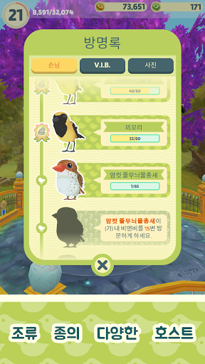 - 이 게임은 AR로도 플레이할 수 있어요! 새 친구들과 마법의 순간을 함께 하고 싶다면 AR 모드로 전환하여 여러분 앞에서 돌아다니는 새를 보세요! 여러분 옆에 있는 애완동물과 새 친구의 사진을 찍고 싶나요? 거실, 옥상, 공원, 관광지, 어디든 좋아요!