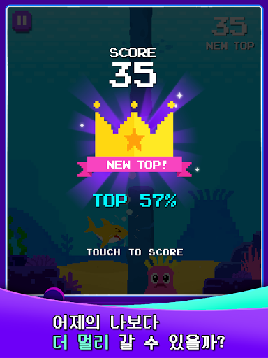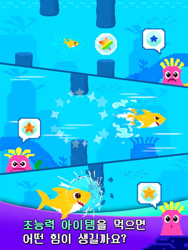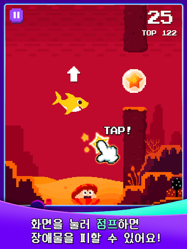 모바일 스크린을 터치하면 아기상어가 위로 헤엄칩니다. 장애물을 피해 별방울을 획득하세요.