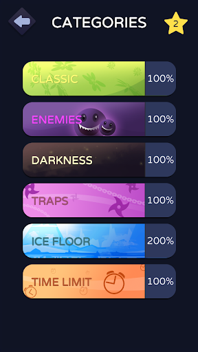 -6 가지 범주 : 클래식, 적, 어둠, 함정, 빙판 및 시간 제한. 각 카테고리에는 최소 100 개의 레벨이 있습니다.