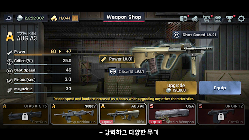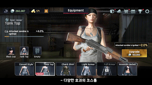 좀비와의 사투에서 승리하기 위하여 강력한 캐릭터와 무기 업그레이드를 진행하세요!