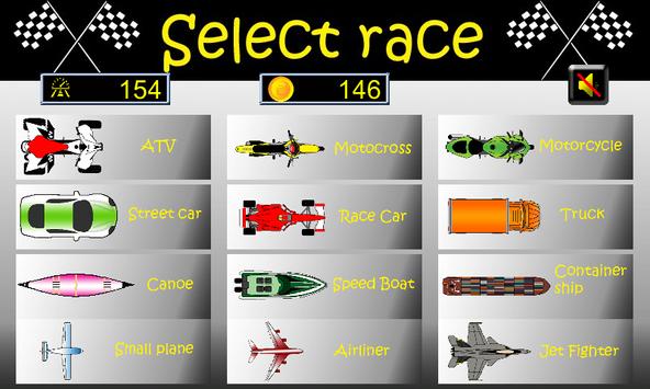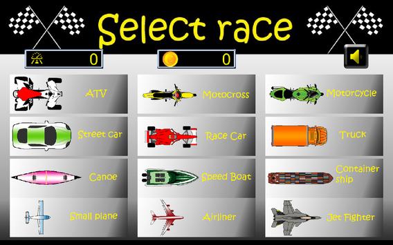 Select your race among different vehicles, boats and planes. Collect coins as you go along and try to avoid your competitors. Use your coins to unlock new races.
