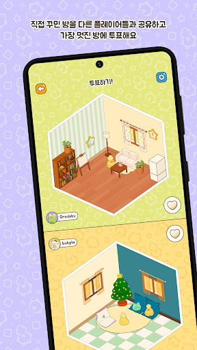 - 직접 꾸민 방을 다른 플레이어들과 공유하고 가장 멋진 방에 투표해요