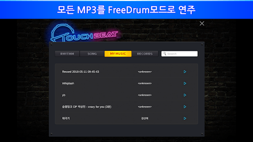 - 취향에 맞는 음악을 선택하여 실제 드럼 연주자처럼 Free drum mode 지원