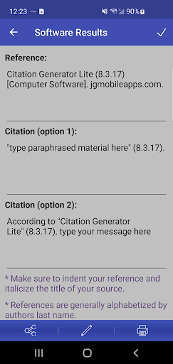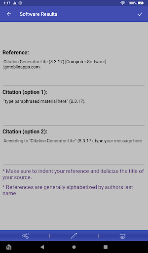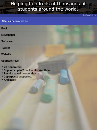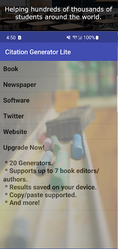 Citation Generator Lite membantu membuat petikan dan rujukan dalam teks untuk format edisi ke-7 Persatuan Psikologi Amerika (APA ™).* Termasuk 5 petikan dalam teks dan penjana rujukan.Menyokong buku, akhbar, perisian, Twitter, dan sumber laman web.