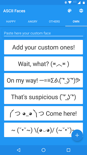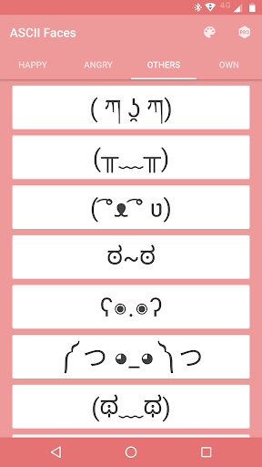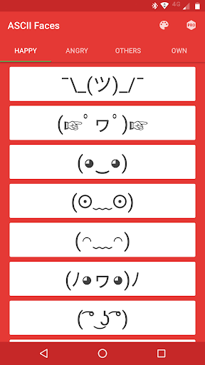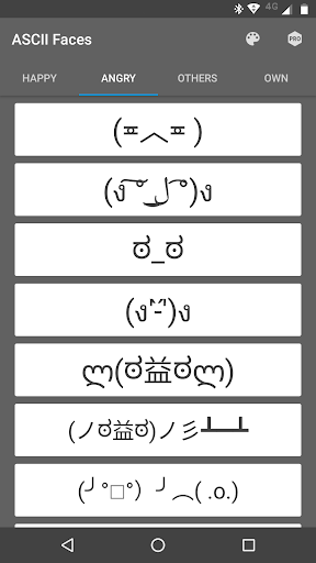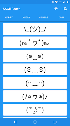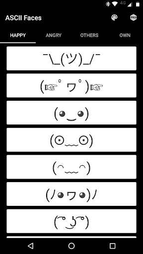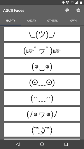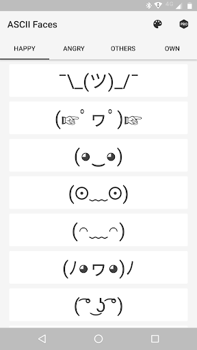 ASCII Faces is a lightweight application that contains a list of ASCII emoticons, to copy an emoticon it only needs to be touched and it will be automatically added to the clipboard.