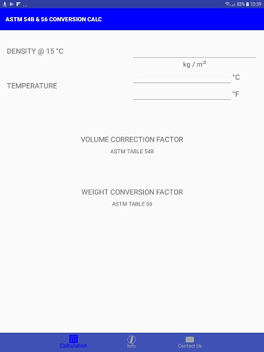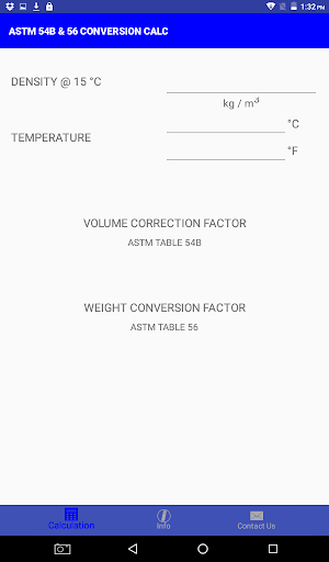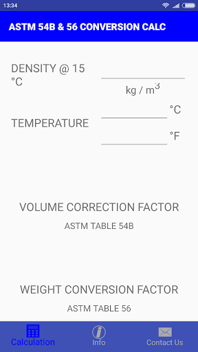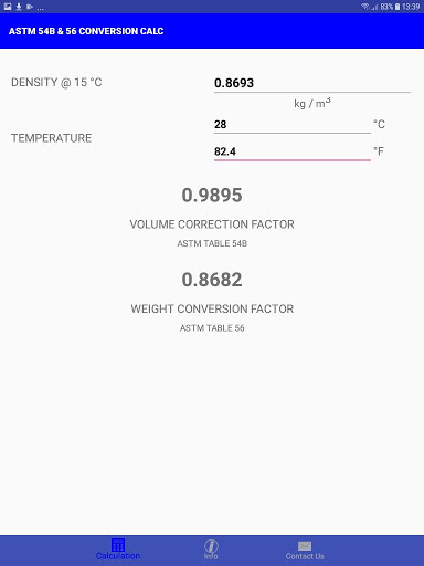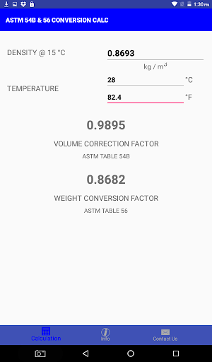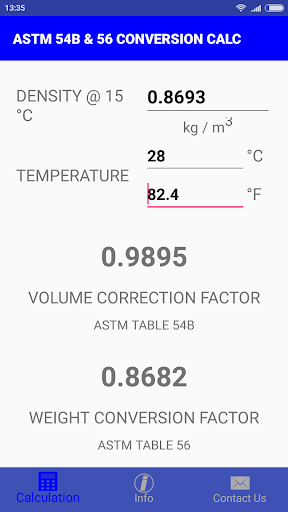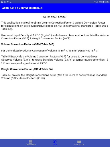 This application is a tool to obtain Volume Correction Factor & Weight Conversion Factor for calculations on petroleum product based on ASTM international standards (Table 54B & Table 56).