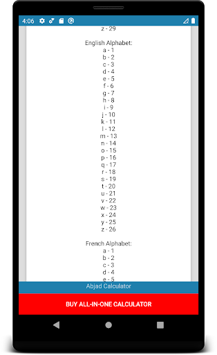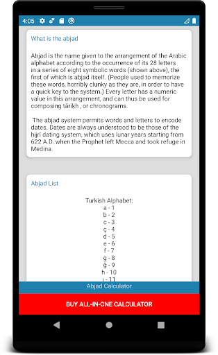 Dalam bahasa Arab, abjad disebut sebagai Abjadiyah. Sistem nombor perpuluhan di mana setiap 28 huruf dalam abjad Arab diberikan pada nilai numerik, angka-angka ini disebut sebagai angka Abjad. Nombor abjad digunakan untuk melaksanakan tujuan matematik yang berbeza sebelum pengenalan sistem angka Hindu-Arab. Dalam bahasa Arab moden, nombor ini digunakan dalam garis penomboran, item dalam senarai, dan titik maklumat. Ia juga digunakan dalam numerologi untuk memberikan nombor yang setara untuk perkataan Arab. Kalkulator Adad di atas menyenaraikan jadual huruf Arab, nama dan nilai berangka. Nombor ini boleh digunakan untuk ilmu mistik, kad tarot, nyanyian zodiak, horoskop, astrologi, carta kelahiran.