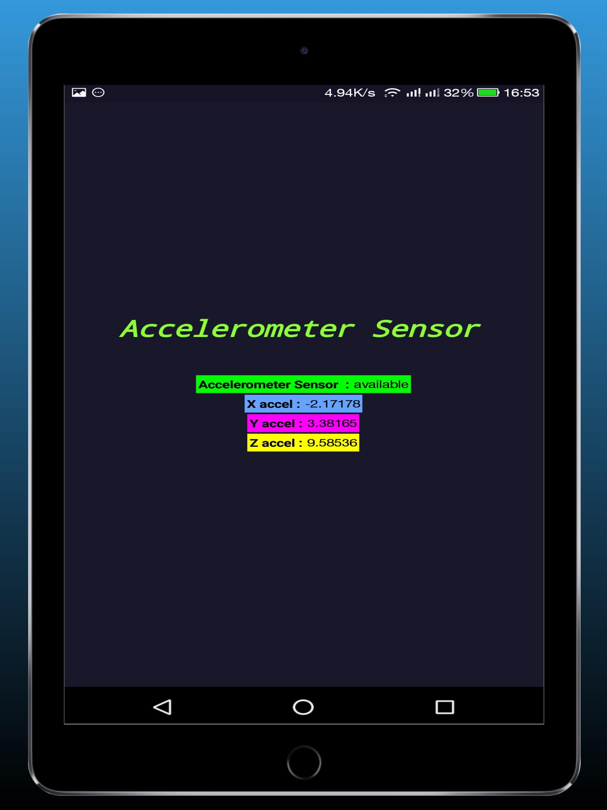 This app using your device built-in accelerometer sensor and shows your the X accel value, the Y accel value and the Z accel.