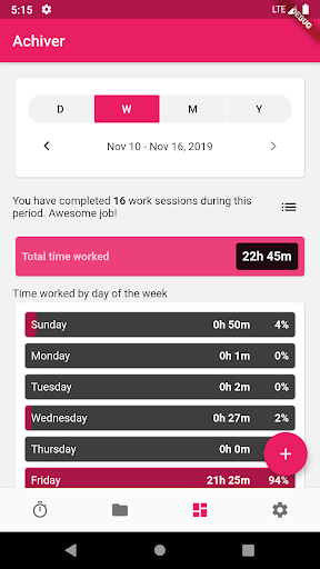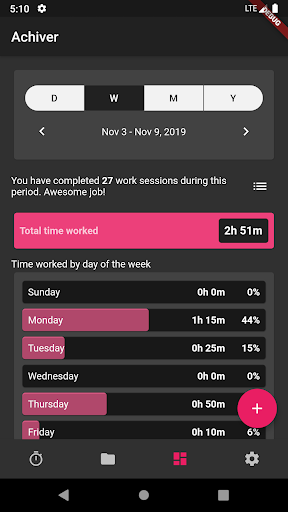 Apemasa gaya pomodoro dan penjejak masa, untuk mengesan masa yang dihabiskan untuk setiap projek anda.Menyokong pelbagai projek.Menyediakan analisis yang dikategorikan berdasarkan projek, hari, minggu, bulan, sehingga lebih mudah bagi anda untuk mengenal pasti kemajuan anda.Lihat juga statistik berdasarkan hari dalam seminggu untuk mengetahui hari dalam seminggu mana yang paling produktif anda.Mampu memasukkan log tersuai, atau secara automatik mengesan masa dengan pemasa pomodoro secara terbina dalam.