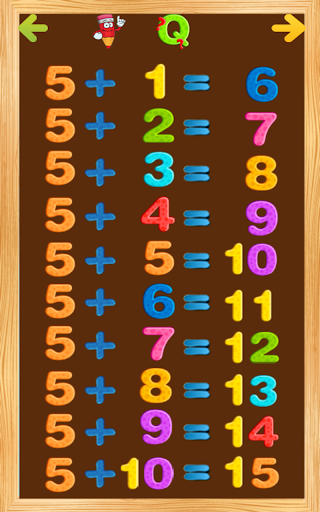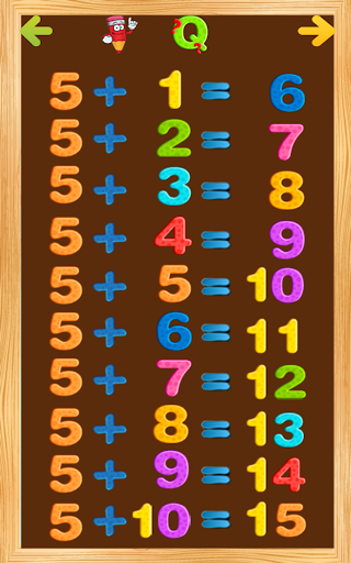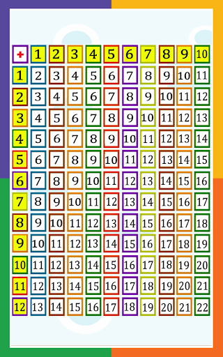 Ciri aplikasi * Jadual Penambahan dari 1-15 * Sesi Latihan dan Pertanyaan untuk setiap meja * Sesi latihan yang menggabungkan semua jadual * * Berwarna-warnipermainan gelembung * Lembaran Kerja Tambahan * Bingo * Carta Penambahan * Kuiz
