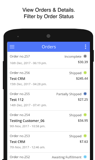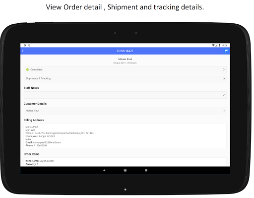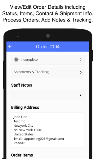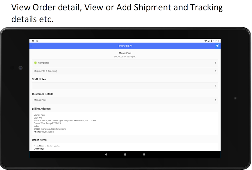 Pesanan: Lihat Senarai Pesanan (Terkini Pertama) atau Bor ke Perintah Khusus untuk Melihat Nilai, Item yang Dipesan, Pengebilan & amp;Alamat penghantaran, nota kakitangan, komen pelanggan dan butiran lengkap pelanggan.Anda boleh menapis pesanan mengikut status, cari mana -mana pesanan dengan ID, tukar status sebarang pesanan tertentu atau tambahkan nota kakitangan.Di samping itu, anda boleh melihat/menambah penghantaran & amp;Maklumat Penjejakan untuk sebarang pesanan.Keranjang terbengkalai juga boleh didapati sebagai ' Pesanan tidak lengkap '.Nota kakitangan boleh ditambah melalui aplikasi.(Produk dalam aplikasinya: langganan $ 0.99/bulan)