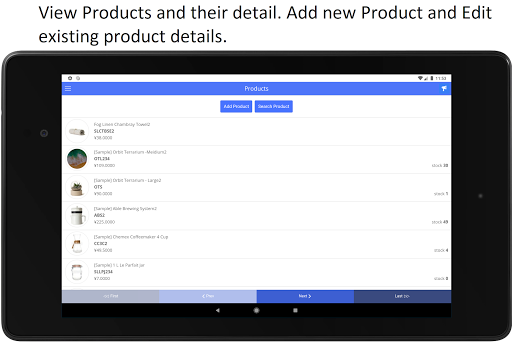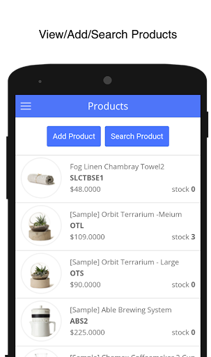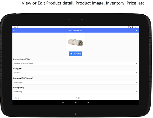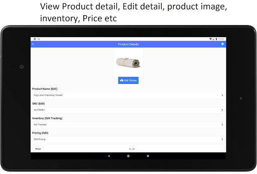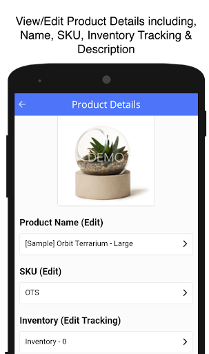 Produk: Lihat Senarai Produk atau cari produk yang menggunakan SKU atau Nama.Lihat/Edit mana -mana butiran produk termasuk imej produk, tahap inventori, harga, sku atau keterangan.Imej boleh dimuat naik dari galeri atau kamera gambar mudah alih anda.Anda juga boleh membuat dan menambah produk baru melalui aplikasi.(Produk dalam aplikasinya: langganan $ 3.99/bulan)