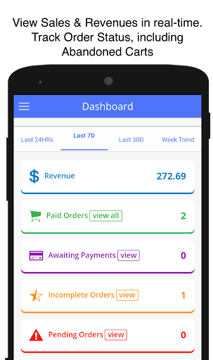 Dashboard: Papan pemuka masa nyata, pesanan (dengan status berpecah) selama 24 jam terakhir, 7 hari & amp;30 hari.Butiran termasuk pendapatan yang ditempah, bilangan pesanan, pesanan dipenuhi, pesanan tidak lengkap (kereta terbengkalai), pesanan dihantar, pesanan dibatalkan dan pesanan yang dipertikaikan.Trend jualan satu minggu terakhir juga dibentangkan.(Produk dalam aplikasinya: langganan $ 1.99/bulan)