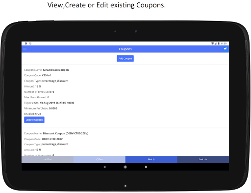 Kupon: Lihat/edit semua kupon aktif/tidak aktif di kedai anda.Butiran kupon termasuk jenis kupon, nilai, keterangan dan tarikh kesahihan.Kupon baru juga boleh dibuat dengan cepat.(Produk dalam aplikasinya: langganan $ 2.99/bulan)