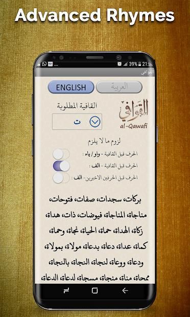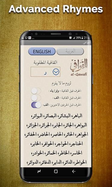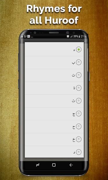 First of its kind in the entire history of apps. It is now as easy as clicks to fetch rhyming words for Arabic language poetry. Just enter the last alphabet of the word you are writing Qasida on - and the list will display an exhaustive list of words rhyming with the aforementioned word.