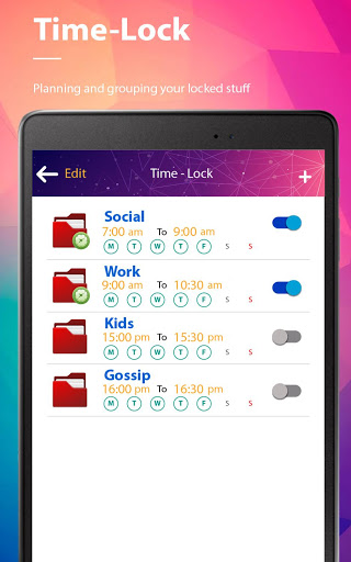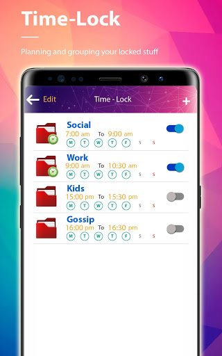 Jadual Utama: Bantuan Anda menguruskan masa dan kumpulan aplikasi dan menjadualkan akses anda dalam pesanan tertentu. Sebagai contoh, aplikasi yang berkaitan dengan perniagaan seperti e-mel, panggilan, mesej teks, OTT, aplikasi pembayaran akan dikunci secara automatik pada waktu malam.