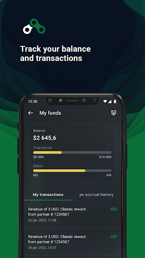 Aplikasi yang memenuhi sepenuhnya keperluan komuniti rakan kongsi moden: keseimbangan terkini, sejarah transaksi dan akses cepat ke skim pasukan dalam antara muka yang mesra pengguna.