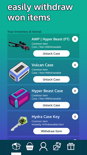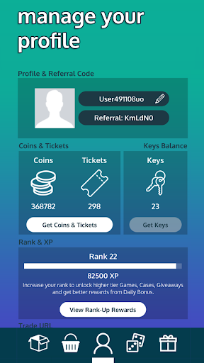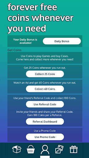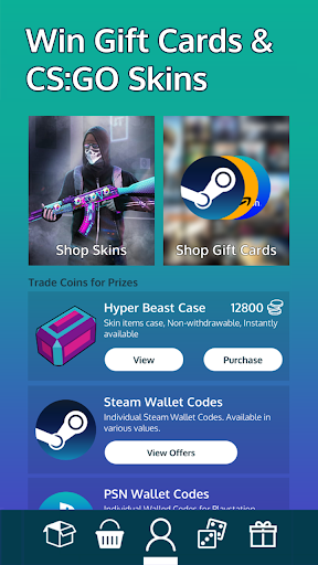 Users play Betting Games using an in-app Currency (COINS). The goal is to collect as many Coins as possible and trade those Coins for CS:GO Skins or Gift Cards.