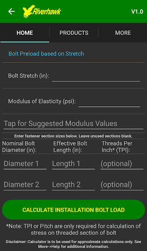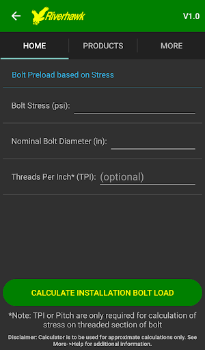 Kalkulator Preload Bolt Riverhawk boleh menghampiri preload Bolt yang diperlukan untuk memasang bolt.Penukaran boleh didapati dalam kedua-dua unit Bahasa Inggeris dan Metrik.