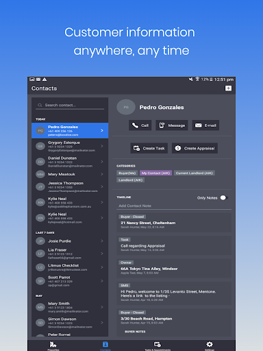 Cari semua kenalan anda, LihatTimeline mereka, membuat panggilan dan menghantar mesej, menambah dan mengemas kini butiran hubungan seperti maklumat peribadi, bio, alamat, kategori dan nota.