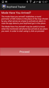- Have You Arrived mode: This mode stablishes a round perimeter of 500 meters in the place of the map chosen by you, what serves as a base to activate an alarm in case the app detects your boyfriend got in this place. In case the app detects your boyfriend has reached that place, an alarm is emitted.