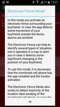 Electric Fence: The Electric Fence mode enables a virtual electric fence around your boyfriend. If the application detects any movement of your boyfriend to outside the fence many alerts will be triggered. This mode helps you know the exact moment in which your boyfriend leaves from a specific location or security purposes.