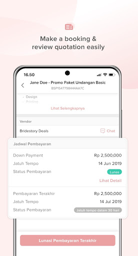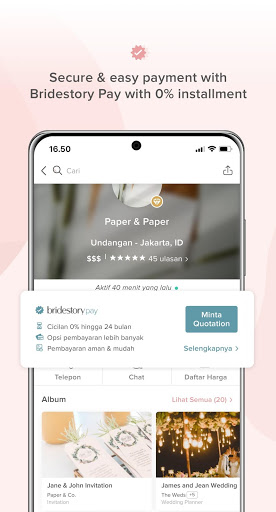 Dengan Bridestory, anda boleh mencari berjuta-juta inspirasi perkahwinan dan profil vendor yang menjadikannya . Hantar mesej dan hubungi vendor melalui ciri sembang untuk mendapatkan senarai harga yang menarik dan promo. Mesej vendor dan gunakan Bayar Bridestory untuk memudahkan pembayaran dengan ansuran 0%. Menerima dan menyemak sebut harga dengan mudah melalui sembang & e-mel. Cari beribu-ribu pakej perkahwinan dan promosi yang menarik dalam satu aplikasi. Anda juga boleh menikmati penyediaan perkahwinan yang lebih selamat dengan reschedule pilihan.