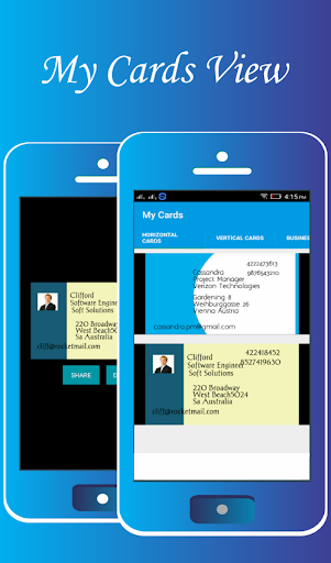 Business Cards Maker is used to design e-visiting cards for you. Now share your visiting cards with your friends, relatives, clients and business men etc.