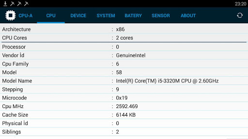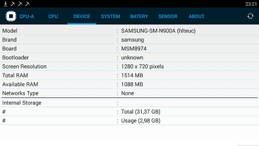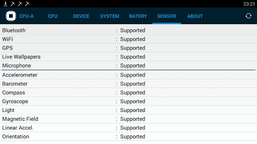 - Maklumat sensor: Bluetooth, Wifi, GPS, Accelerometer, Barometer, Kompas, NFC, Cahaya, Tekanan, Vektor Putaran, Medan Magnetik, Kedekatan. CPU Z, CPU X, Monitor CPU, CPU Cooler Monitor, CPU Specs, COU CPU Test, gpu z