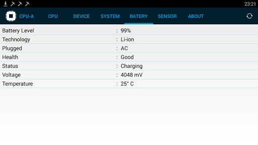 - Maklumat bateri: level, teknologi , status, kesihatan, suhu voltan, kapasiti; bateri dan suhu cpu