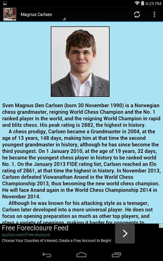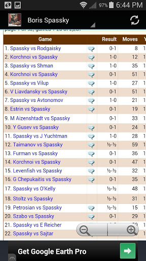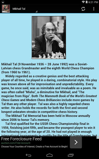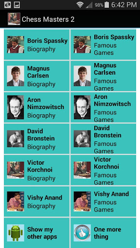 The purpose of this application is to acquaint the viewer with the lives of ten more of the most famous chess Grand Masters. A portrait of each accompanied with a brief biography is available as well as a link to an incredible web site (Chessgames.com) that permits the user to step through anyone of hundreds of games played by them over the years.