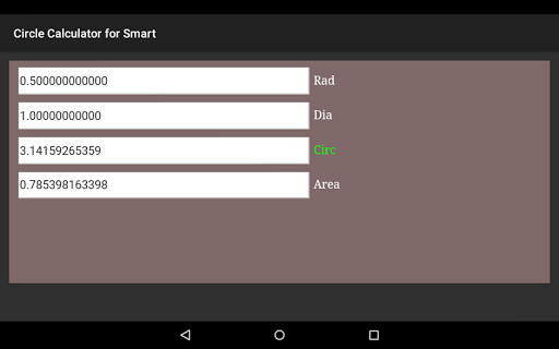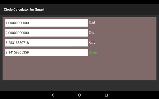 Kalkulator bulatan adalah kalkulator unit kurang, yang bermaksud anda boleh meletakkan pengukuran anda dalam mana-mana unit ukuran yang anda mahu!Masukkan nilai yang diketahui dan aplikasi ini secara automatik akan melengkapkan semua kotak kosong.