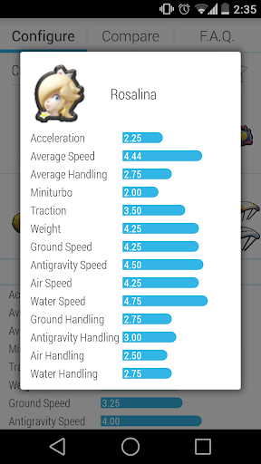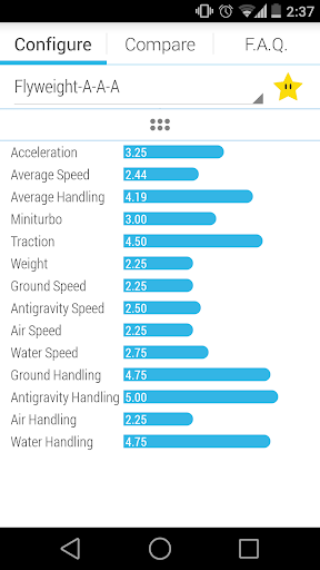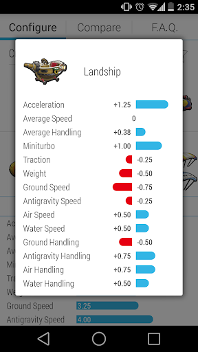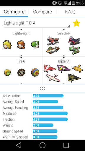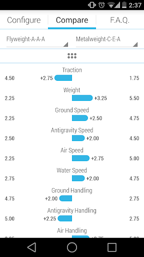 In Configure MK8, you can automatically configure the combination by setting the value of important attributes such as acceleration, speed, and handling. You can also tweak the configurations by selecting exactly which parts to use. After saving a few combinations, you can compare them and see the trade-offs between your favorite combinations.