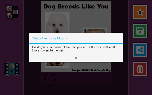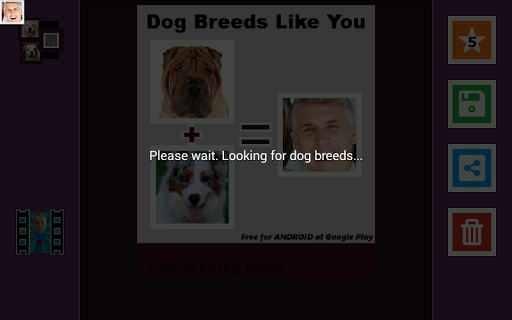 Find out which dog breeds most look like you (look alike)! Upload any photo or picture saved in your cell phone or tablet memory and find out! Select friends in Pictures and share the results on facebook or whatsapp!