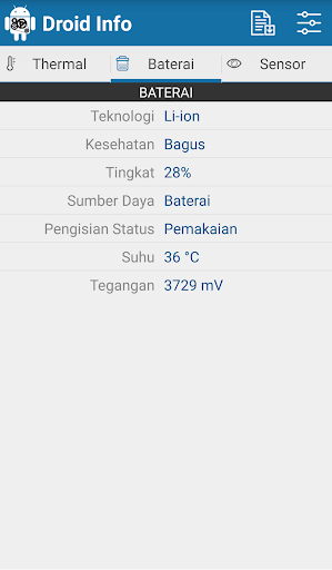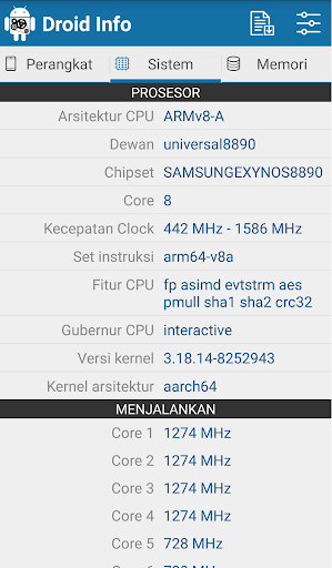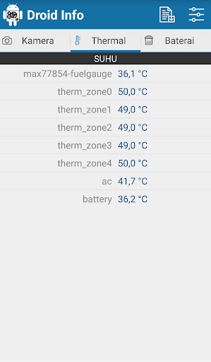 Maklumat Droid adalah spesifikasi aplikasi perkakasan untuk Android dengan maklumat terperinci tentang telefon pintar anda termasuk peranti, sistem, memori, kamera, suhu, bateri dan butiran sensor. Anda juga boleh mengeksport laporan penuh pada telefon pintar anda.